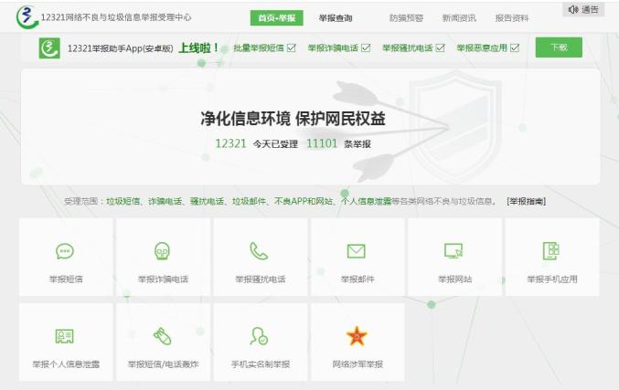 12321网络不良与垃圾信息举报受理中心主要承担关于互联网、电话网等信息通信网络中的不良与垃圾信息举报受理、调查分析以及查处工作。垃圾短信、诈骗电话、骚扰电话、垃圾邮件、不良APP和网站、个人信息泄露等都可以在这个平台进行举报,还可以通过手机号码一键查询举报处理结果。净化信息环境,保护网民权益,我们是受益者,也是参与者。